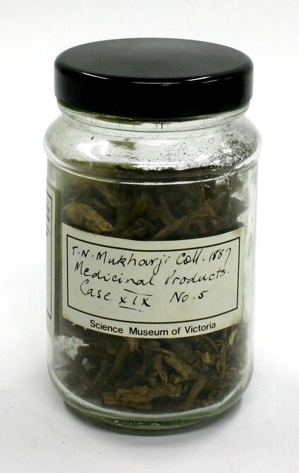 Cylindrical glass jar containing dark brown, short, thin segments of root, like twigs, and sealed with a black plastic lid. Two printed white Science Museum of Victoria labels, with handwritten inscriptions in black ink, are adhered to the outside.