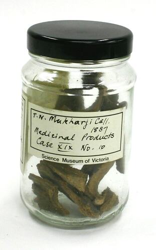 Cylindrical glass jar containing dried dark brown, curled segments of bark, and sealed with a black plastic lid. Two printed white Science Museum of Victoria labels, with handwritten inscriptions in black ink, are adhered to the outside.
