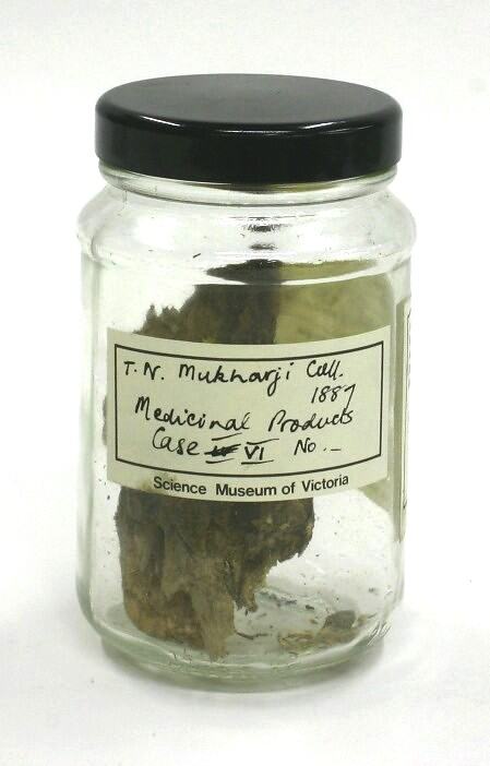 Printed 'Science Museum of Victoria' label with handwritten text affixed to front of jar reads: 'T.N. Mukharji Coll. / 1887 / Medicinal Products / Case VI / No. -'