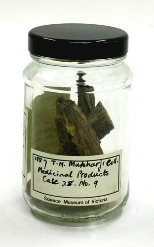 Printed 'Science Museum of Victoria' label with handwritten text affixed to front of jar reads: '1887 T.N. Mukharji Coll. / Medicinal Products / Case 28 / No. 9'