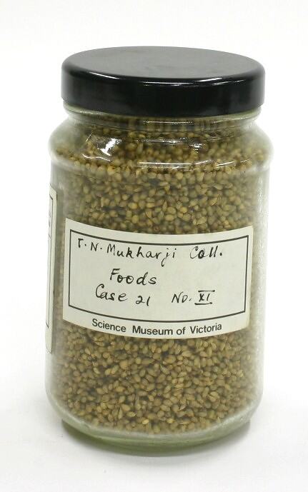 Printed 'Science Museum of Victoria' label with handwritten text affixed to front of jar reads: 'T.N. Mukharji Coll. / Foods / Case 21 / No. XI'