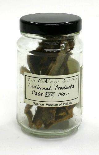 Printed 'Science Museum of Victoria' label with handwritten text affixed to front of jar reads: 'T.N. Mukharji Coll. 1887 / Medicinal Products / Case XXII No. 1'