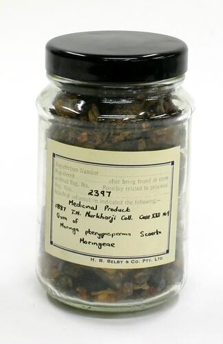 Sample of Moringa pteryposperma gum in a jar. This was collected and prepared by T.N.Mukharji as part of his work for the Indian Botanical Gardens. It was donated to the Museum by the Indian Government, Calcutta in 1887.