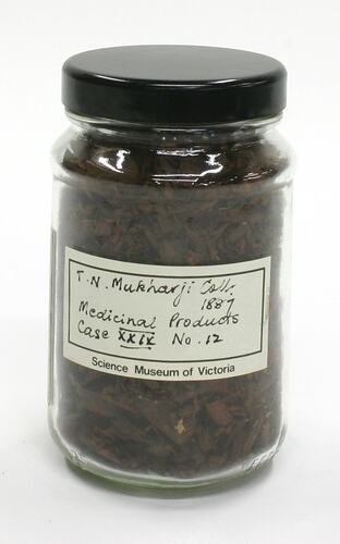 Printed 'Science Museum of Victoria' label with handwritten text affixed to front of jar reads: 'T.N. Mukharji Coll. / 1887 / Medicinal Products / Case XXIX No. 12'