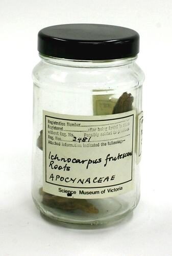 Sample of Ichnocarpus frutescens roots in a jar. This was collected and prepared by T.N.Mukharji as part of his work for the Indian Botanical Gardens. It was donated to the Museum by the Indian Government, Calcutta in 1887.