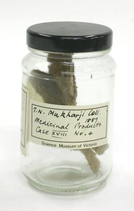 Printed 'Science Museum of Victoria' label with handwritten text reads: 'T.N. Mukharji Coll. / 1887 / Medicinal Products / Case XVII No. 4'