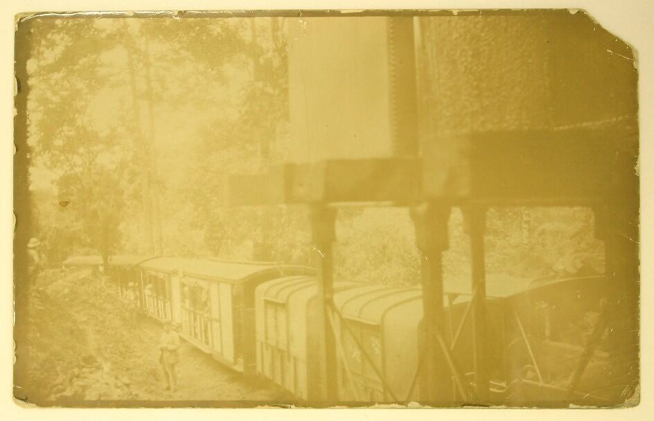 Postcard dating from World War I, showing a black and white photograph of a train on the Darjeeling Railway.