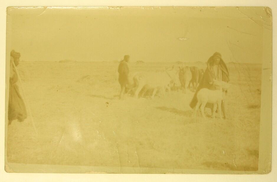Reverse, handwritten: "Arab method of making / Bhoosa (a sort of chaff) driving / the animals round & round / a heap of hay until it is / cut into small pieces" Reverse, printed: "POST CARD / CARTE POSTALE / Communication - Correspondance / Address - Addresse / STAMP / HERE"