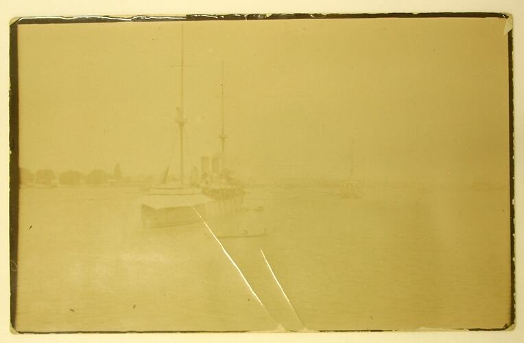 Postcard dating from World War I, showing a black and white photograph of two steam ships anchored on a river in Basra, Iraq. The scene is the same depicted in MM88790.