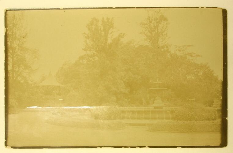 Public garden featuring a fountain, and a gazebo in the background amongst the trees, in Poona (Pune), India.