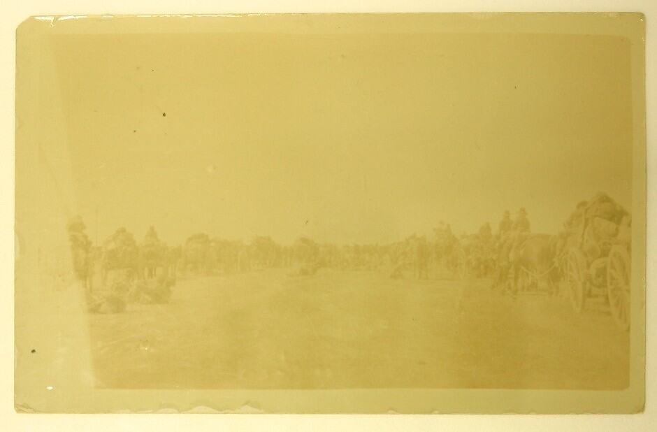 Reverse, handwritten: "On the march (a halt) / One of our wagons is shown / on the extreme right. This carries / mast and gear - very little can be / seen however for the collection of / personal effects stacked on the wagon" Reverse, printed: "POST CARD / CARTE POSTALE / Communication - Correspondance / Address - Addresse / STAMP / HERE"