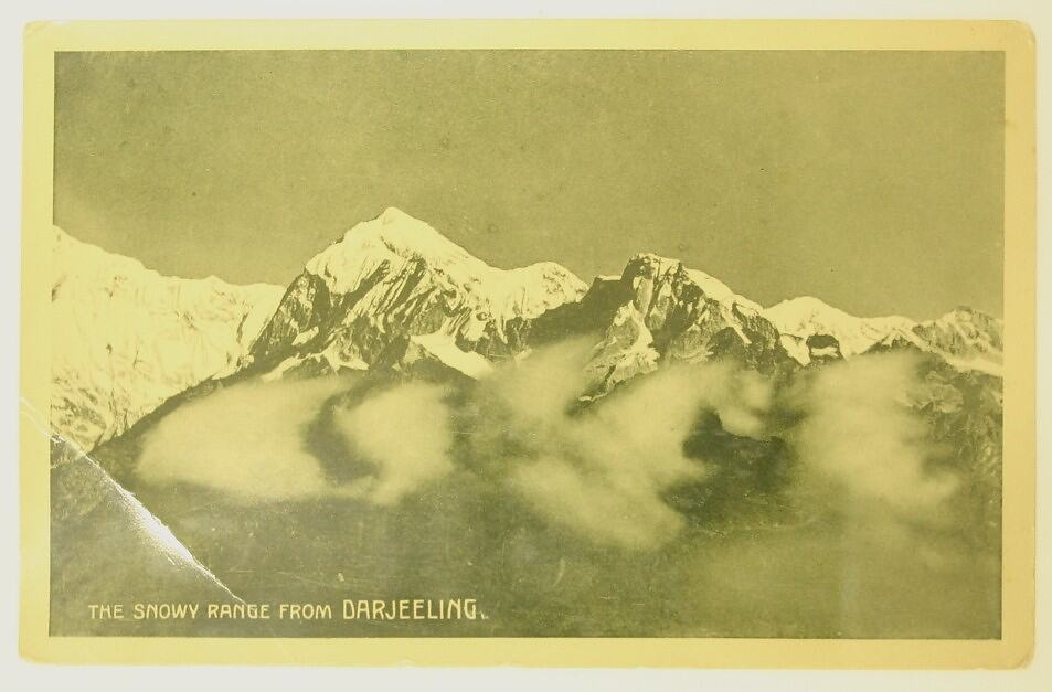 Postcard dating from World War I, showing a black and white photograph of a view of a snowy range from Darjeeling, India.