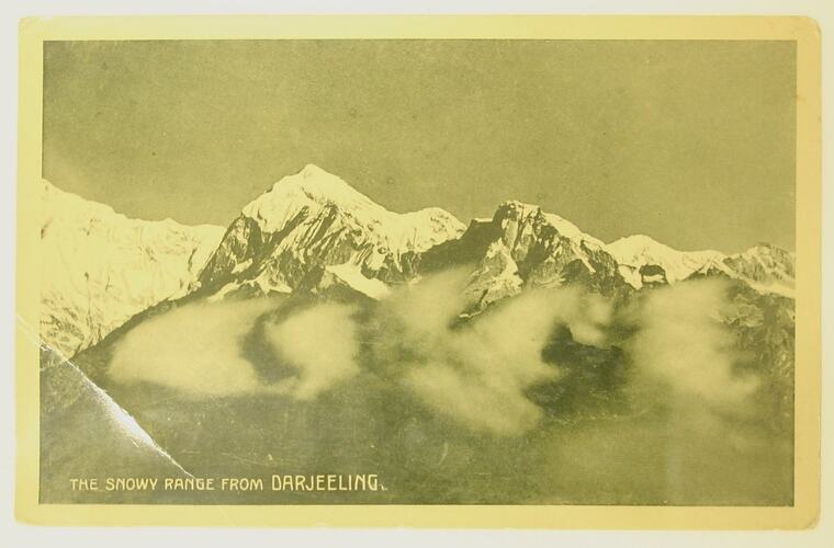 Front, printed: "THE SNOWY RANGE FROM DARJEELING" Reverse, handwritten: "A view of the snows. / It looks magnificent from / Darjeeling" Reverse, printed: "POST CARD / This space may be used for communication / The address only to be written here / India postage / 3 pies / To Europe / 1 anna"