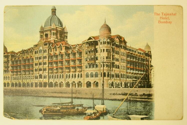 Post card featuring a coloured drawing of the Tajmahal Hotel in Bombay, India, situated on a waterfront on which small boats are anchored. The post card contains a short handwritten note on the reverse, dated 22 June 1916, is signed "Lionel", and is addressed. A stamp and ink post mark are in the upper right corner. The card shows signs of discolouration and is curled.