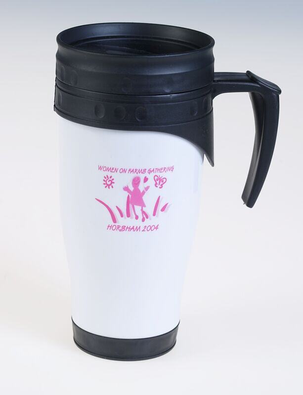 White and black plastic travel mug, with Women on Farms Gathering Horsham 2004 logo, packed in black cardboard box, given to participants in their Gathering bag upon registration.