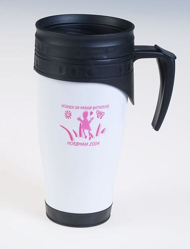 White plastic insulated travel mug, with matt black plastic base, rim with handle and screw on lid with sliding mouthpiece cover. Interior is shiny black plastic. Pink WOFG Horsham 2004 logo is on front of mug. Blue logo of State Government of Victoria, Department for Victorian Communities is on the back. Packed in a plastic bag inside a black cardboard box. Box has white barcode label on back. Made in China.