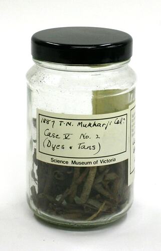 Printed 'Science Museum of Victoria' label with handwritten text affixed to front reads: '1887 T.N. Mukharji Coll / Case V No. 2 / (Dyes & Tans)