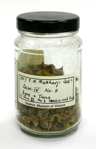 Cylindrical glass jar, sealed with a black plastic lid, containing fragments of dried, yellow and light brown flowers. Two printed Science Museum of Victoria labels, with handwritten inscriptions in black ink, are adhered to the outside.