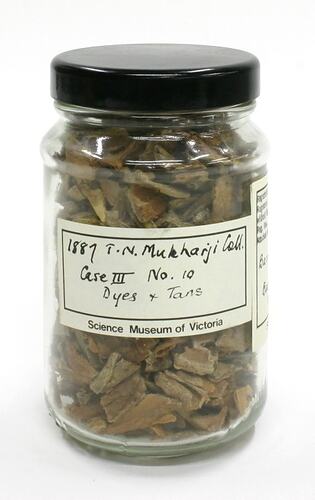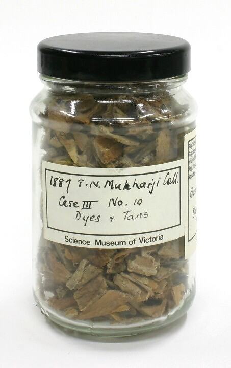 Label, handwritten: "1887 T.N. Mukharji Coll. / Case III No. 10 / Dyes & Tans" Label, handwritten: "Barringtonia / acutangula / Bark / MYRTACEAE"