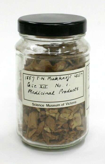 Label, handwritten: "1887 T.N. Mukharji Coll. / Case XII No. I / Medicinal Products" Label, handwritten: "BARK / CASSIA FISTULA / N.O. LEGUMINOSAE / LINN"