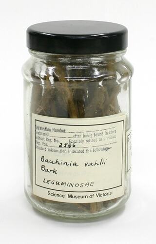 Cylindrical glass jar, sealed with a black plastic lid, containing thin, light brown, fibrous lengths of bark. Two printed Science Museum of Victoria labels, with handwritten inscriptions in black ink, are adhered to the outside.