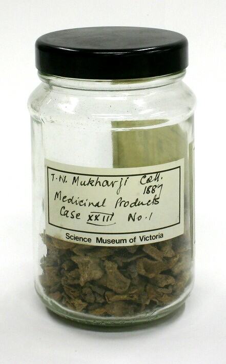 Label, handwritten: "T.N. Mukharji Coll. 1887 / Medicinal Products / Case XXIII No. 1" Label, handwritten: "Musa paradisiaca / Roots / MUSACEAE"