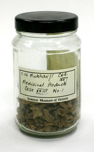 Cylindrical glass jar, sealed with a black plastic lid, containing fragments of grey-brown root. Two printed Science Museum of Victoria labels, with handwritten inscriptions in black ink, are adhered to the outside.