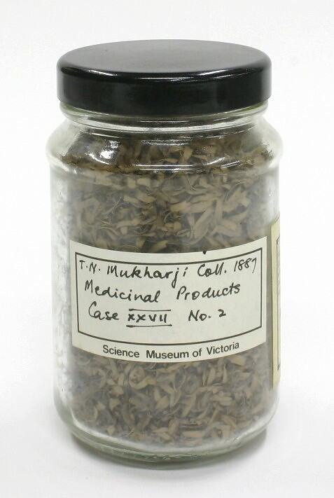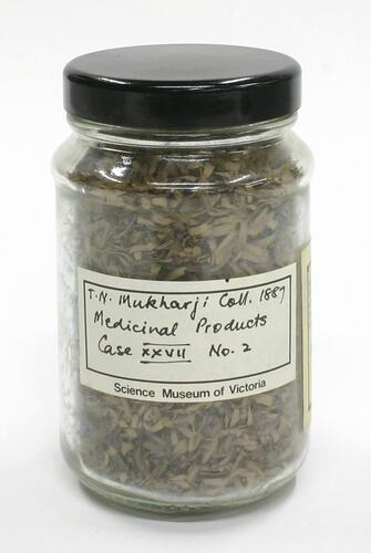 Cylindrical glass jar, sealed with a black plastic lid, containing small, dried, pale olive green leaves. Two printed Science Museum of Victoria labels, with handwritten inscriptions in black ink, are adhered to the outside.
