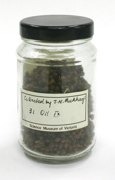 Label, handwritten: "Collected by T.N. Mukharji / 31 Oil IX" Label, handwritten: "SEEDS OF / XANTHIUM / STUMARIUM / COMPOSITAE"