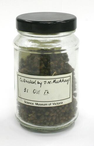 Cylindrical glass jar, sealed with a black plastic lid, containing clusters of small round brown seeds with prickly surfaces. Two printed Science Museum of Victoria labels, with handwritten inscriptions in black ink, are adhered to the outside.