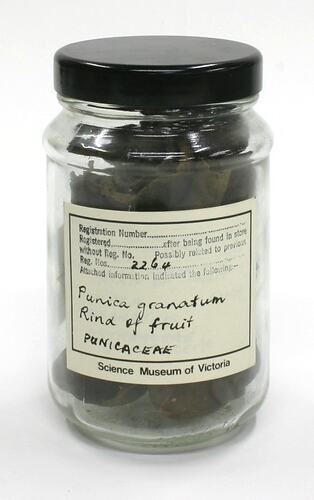 Cylindrical glass jar, sealed with a black plastic lid, containing the hard, dark brown, semi-circle rinds of pomegranate. Two printed Science Museum of Victoria labels, with handwritten inscriptions in black ink, are adhered to the outside.