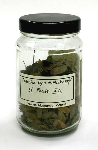 Cylindrical glass jar containing small, oval, pale green dried leaves. Two printed white Science Museum of Victoria labels, with handwritten inscriptions in black ink, are adhered to the outside.