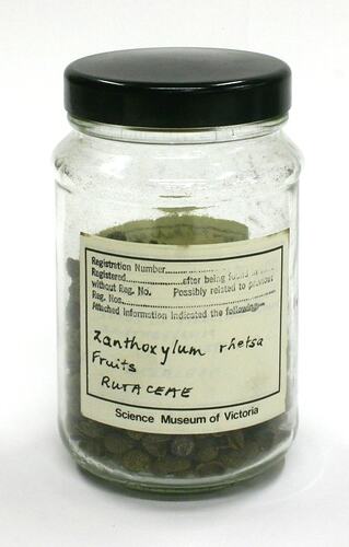 Cylindrical glass jar, sealed with a black plastic lid, containing small, round, brown pods, some split in half. The pods contain black seeds. Two printed white Science Museum of Victoria labels, with handwritten inscriptions in black ink, are adhered to the outside.