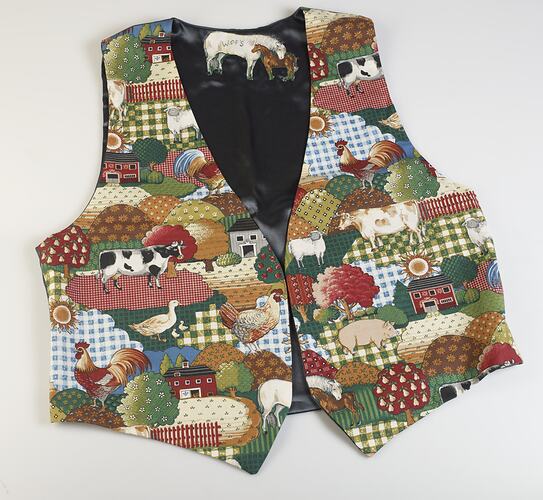 Cotton vest with silk lining. Front panels have a colourful pattern which features farm animals and buildings, the rear panel is green satin-like material. The inside top edge has a cut-out panel of a horse and foal with a hand printed in pen: 'W.O.F's'.