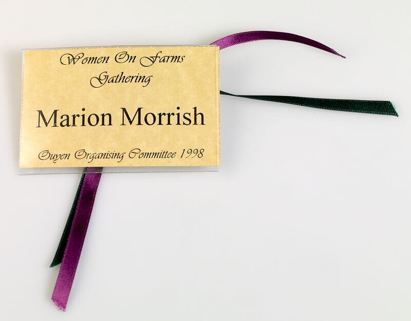 Name tag worn by committee member Marion Morrish at the 1998 Ouyen Gathering. During the Gathering Marion delivered a speech about the hardships that she had faced during her life on the farm. Despite the mouse plagues, droughts and loneliness, she spoke about how 'the community spirit remains as strong as ever.'