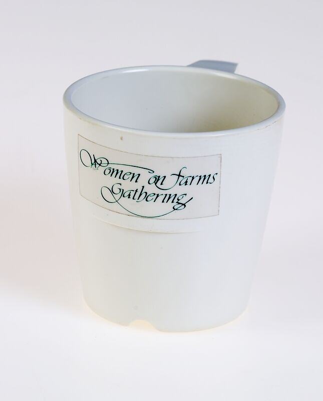 Cream melamine mug given to participants of the 1993 Tallangatta Women on Farms Gathering. This was the first Gathering to have a memento mug, which was sourced and created by one of the Tallangatta Gathering committee members, Denise Kirk. The mugs were purchased from Murray Goulburn Kiewa factory then an Albury firm created the labels. Each person registered at the Gathering received one and were asked to use them over the weekend.