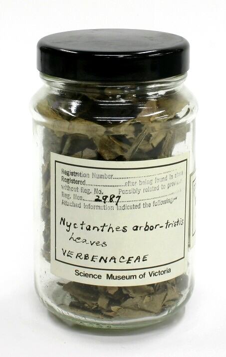 Sample of Nyctanthes arbortristis leaves. This was collected and prepared by T.N.Mukharji as part of his work for the Indian Botanical Gardens. It was donated to the Museum by the Indian Government, Culcutta in 1887.