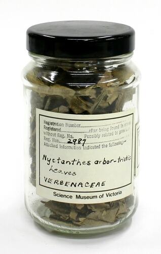 Cylindrical glass jar containing dried, light brown, brittle leaves, and sealed with a black plastic lid. Two printed white Science Museum of Victoria labels, with handwritten inscriptions in black ink, are adhered to the outside.