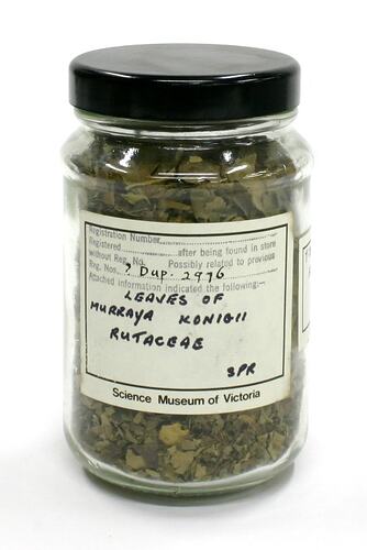 Cylindrical glass jar containing fragmented, dried, pale green leaves and sealed with a black plastic lid. Two printed white Science Museum of Victoria labels, with handwritten inscriptions in black ink, are adhered to the outside.