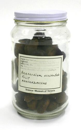 Sample of Anacardium occidentale dried fruits in a jar. This was collected and prepared by T.N.Mukharji as part of his work for the Indian Botanical Gardens. It was donated to the Museum by the Indian Government, Calcutta in 1887.