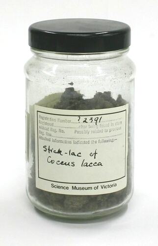 Cylindrical glass jar, sealed with a black plastic lid, containing dark brown, irregular-shaped fragments of hardened lac. Two printed Science Museum of Victoria labels, with handwritten inscriptions in black ink, are adhered to the outside.