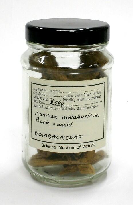 Printed 'Science Museum of Victoria' label with handwritten text affixed to front of jar reads: 'T.N. Mukharji Collection / 1887' Printed 'Science Museum of Victoria' label with handwritten text affixed to reverse of jar reads: 'Bombax malabaricum / Bark & wood / BOMBACACEAE'