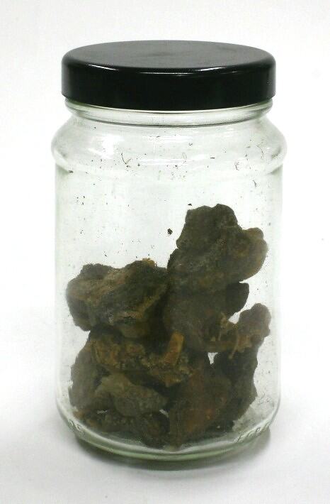 Cylindrical glass jar with black plastic screw-top lid containing light brown sections of hardened gum.