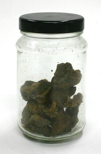 Sample of Cochlospermum gossypium gum in a jar. This was collected and prepared by T.N.Mukharji as part of his work for the Indian Botanical Gardens. It was donated to the Museum by the Indian Government, Calcutta in 1887.