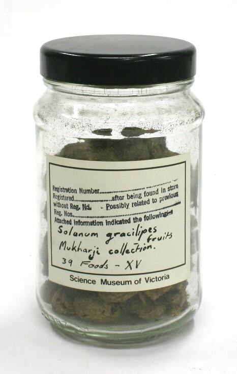 Printed 'Science Museum of Victoria' label with handwritten text affixed to jar reads: 'Solanum gracilipes / fruits / Mukharji collection. / 39 Foods - XV'