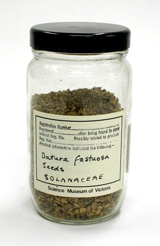 Sample of Datura fastuosa (Solanaceae) seeds. This was collected and prepared by T.N.Mukharji as part of his work for the Indian Botanical Gardens. It was donated to the Museum by the Indian Government, Culcutta in 1887.