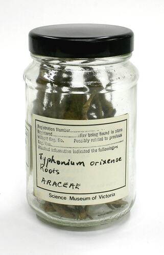 Printed 'Science Museum of Victoria' label with handwritten text affixed to front of jar reads: '1887 T.N. Mukharji Coll. / Medicinal Products / Case XXXIX No. 7' Printed 'Science Museum of Victoria' label with handwritten text affixed to reverse of jar reads: 'Typhonium orixense / Roots / ARACEAE'