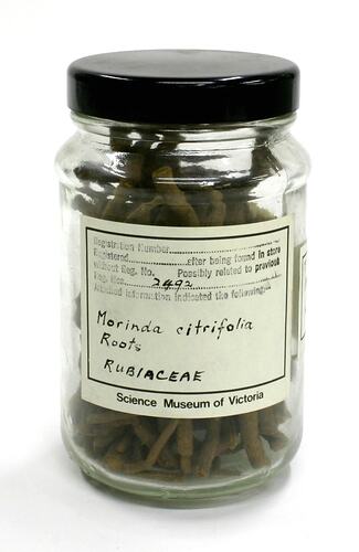 Printed 'Science Museum of Victoria' label with handwritten text affixed to front of jar reads: 'T.N. Mukharji Coll. 1887 / Medicinal Products / Case XXII No. 6' Printed 'Science Museum of Victoria' label with handwritten text affixed to reverse of jar reads: 'Morinda citrifolia / Roots / RUBIACEAE'