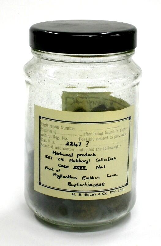 Printed 'Science Museum of Victoria' label with handwritten text affixed to front of jar reads: '1887 T.N. Mukharji Coll. / Medicinal Products / Case XXVII No. 1' Printed 'Science Museum of Victoria' label with handwritten text affixed to reverse of jar reads: 'Medicinal product / 1887 T.N. Mukharji Collection / Case XXVII No. 1 / Fruit of / Phyllanthus Emblica Linn. / Euphorbioceae'