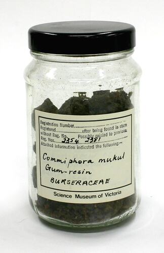Sample of Commiphora mukul (Burseraceae) resin. This was collected and prepared by T.N.Mukharji as part of his work for the Indian Botanical Gardens. It was donated to the Museum by the Indian Government, Culcutta in 1887.